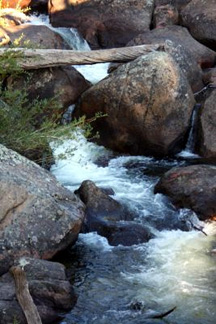 You are now in the water with me, walking gingerly and wondering if we can keep our footing. We walk toward the rushing rapids upstream, hopping up on large boulders occasionally to survey our progress and watch the water eddy around the boulders. It makes sounds and paths that change each time we take our eyes away.